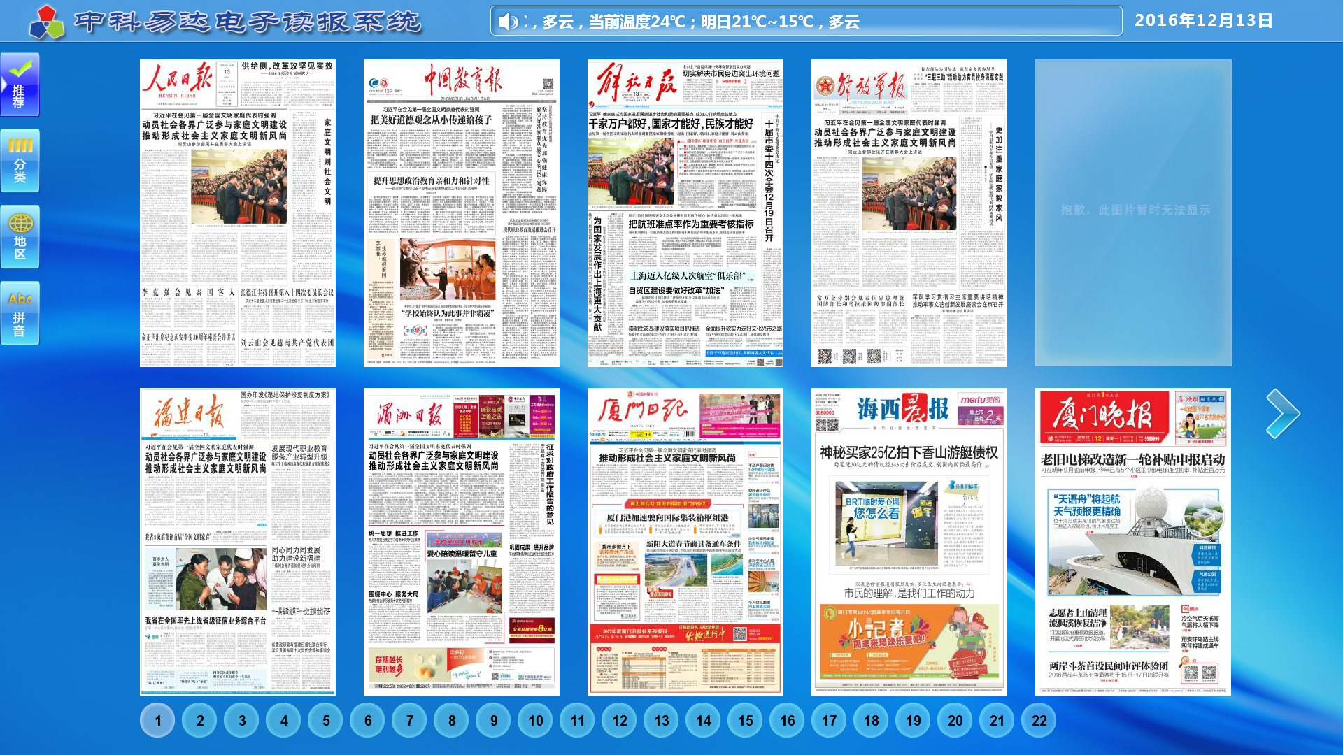 觸摸屏報刊閱讀系統(tǒng)現(xiàn)可實現(xiàn)分類查詢,往期檢索,滑動翻頁,放大閱讀,自動適時更新等功能。